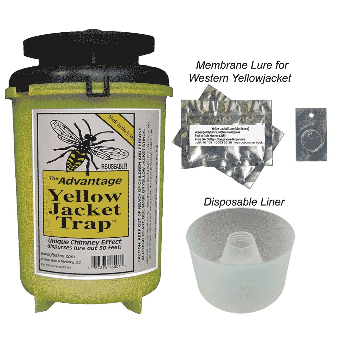 The Advantage Yellow Jacket Trap is equipped with a disposable liner and two Yellow Jacket Banquet Attractants per trap. The Advantage Yellow Jacket Trap includes 2 membrane lures to attract Western Yellow Jackets which are predominantly found west of Texas.